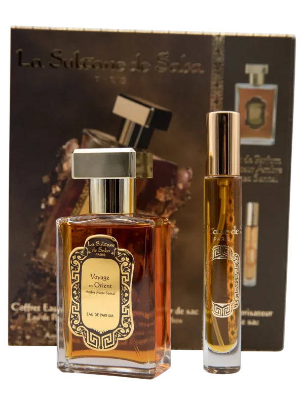 La Sultane de Saba Parfum Set Oriental Ayurvedic Amber Vanilla Patchouli carries a harmony of amber, vanilla, and patchouli, inspired by ancient Indian traditions. It evokes a journey along the spice route, blending subtle notes into a captivating Eau de Parfum. This fragrance unveils a subtle harmony between amber, vanilla and patchouli.